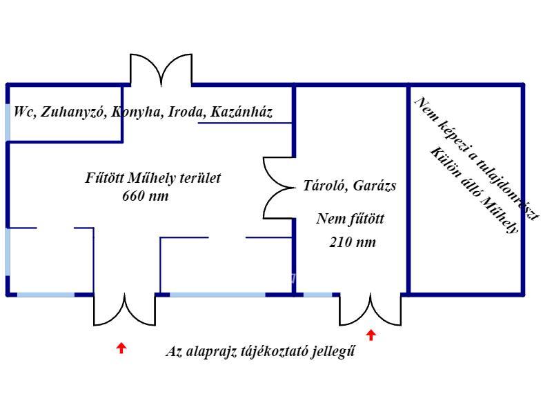 Műhely 870 nm - 660 nm fűthető bálás kazánnal központi fűtési rendszerrel hő leadása radiátorokon keresztül.