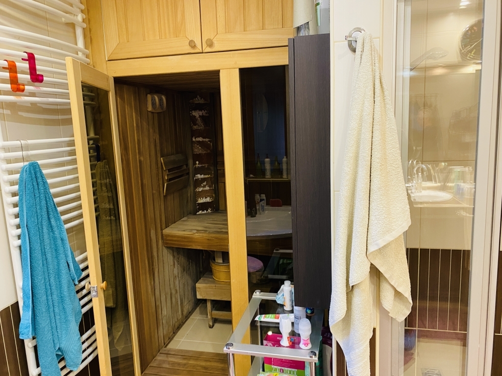 Otthoni SPA: Két fürdőszoba, melyből az egyik egy komplett wellness részleg szaunával, sarokkáddal és zuhanyzóval.