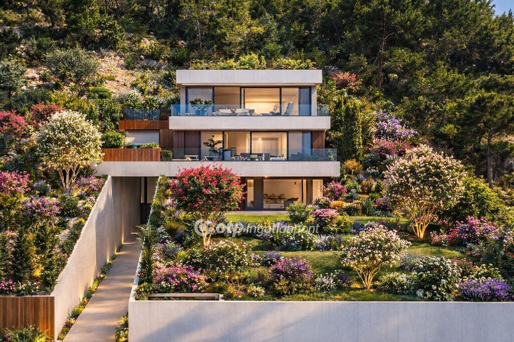 illeszkedik a domborzathoz, és a lejtős részen kialakított, panorámás lakóterekkel rendelkezik.