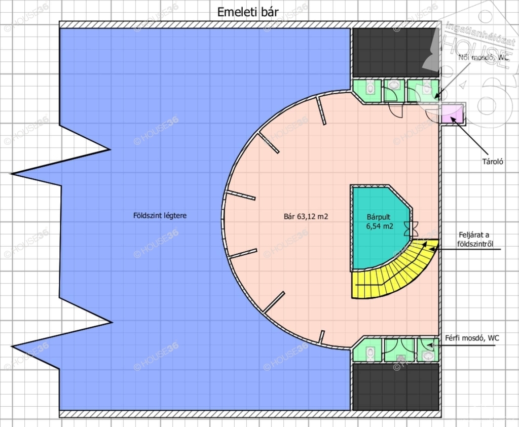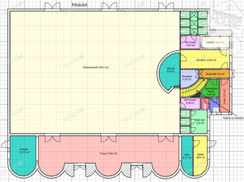 Főépület: 540 m² földszint + 90 m² emeleti bár