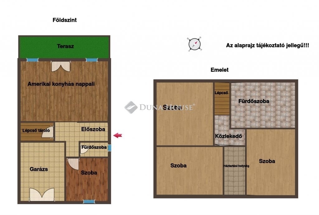Az Élettérről(140m2): földszint: előszoba, közlekedő, fürdőszoba, lépcsőtároló, amerikai-konyhás-nappali, szoba, fűtött garázs.