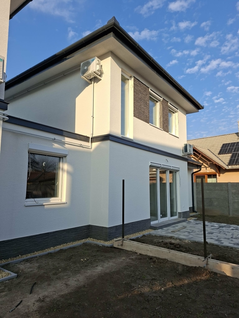 Sarki egyedi kialakítású, 2 szobás nagy nappalis világos nagy terekkel rendelkező 89 m2 es emeleti hálószobákkal, szenkcionált garázs kapuval, különleges egyedi üvegezésű korláttal terasszal.