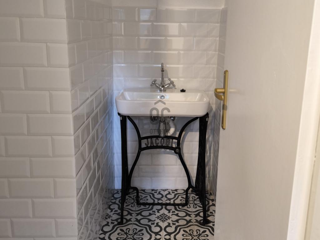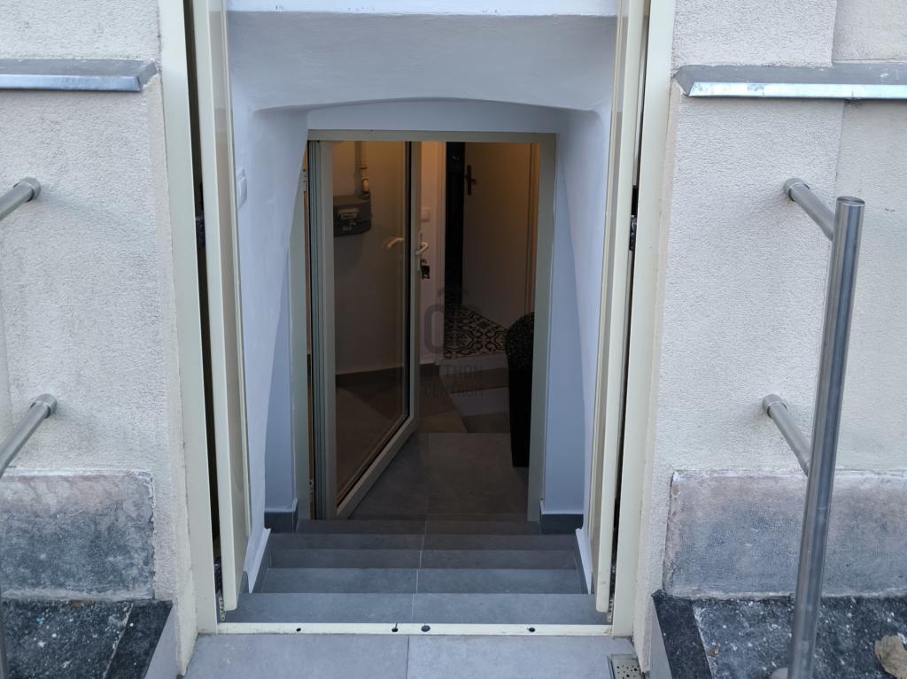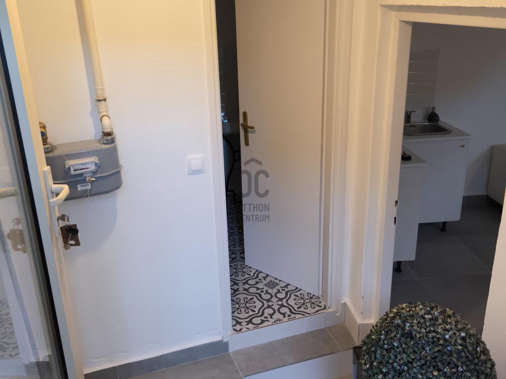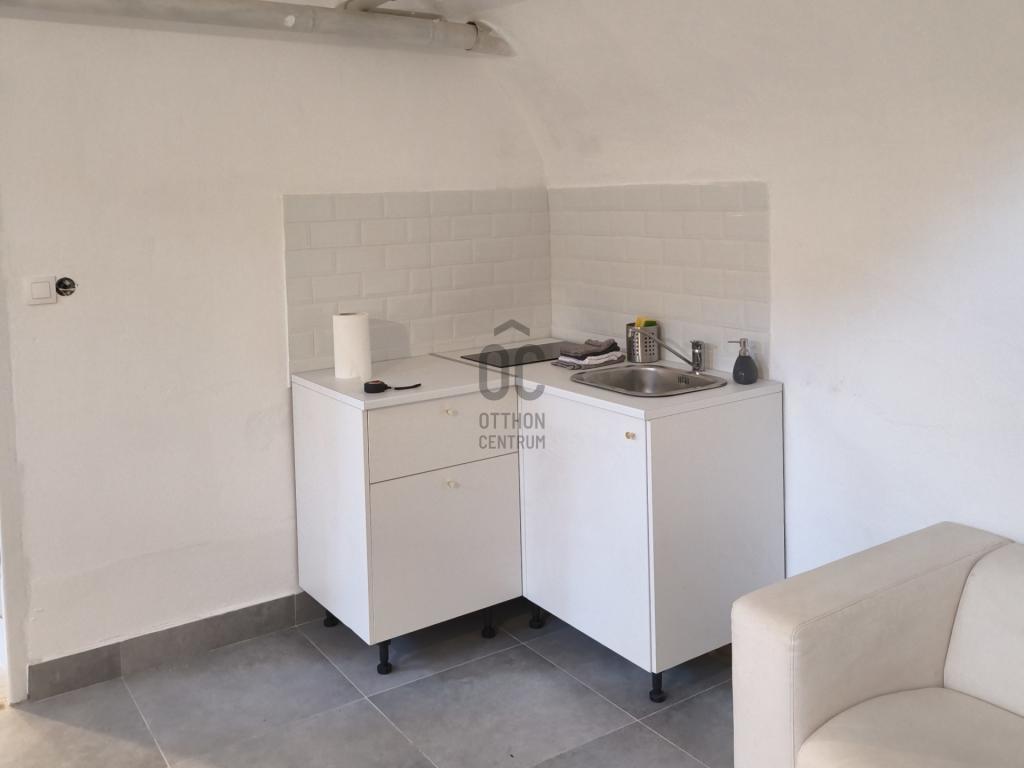 A helység frissen burkolt, az utcáról hideg burkolatos lépcső vezet le az előtérbe, ahonnan nyílik egy mellékhelység és a 25 nm-es fő helyiség, ahol egy beépített konyhapult indukciós főzőlappal található.