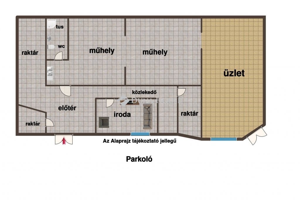 Az ingatlanban kialakítottak egy igényes eladó teret/üzletet, két műhely részt, irodát, több raktár helyiséget, közlekedő résszel és WC-t, mosdóval, tusolóval.