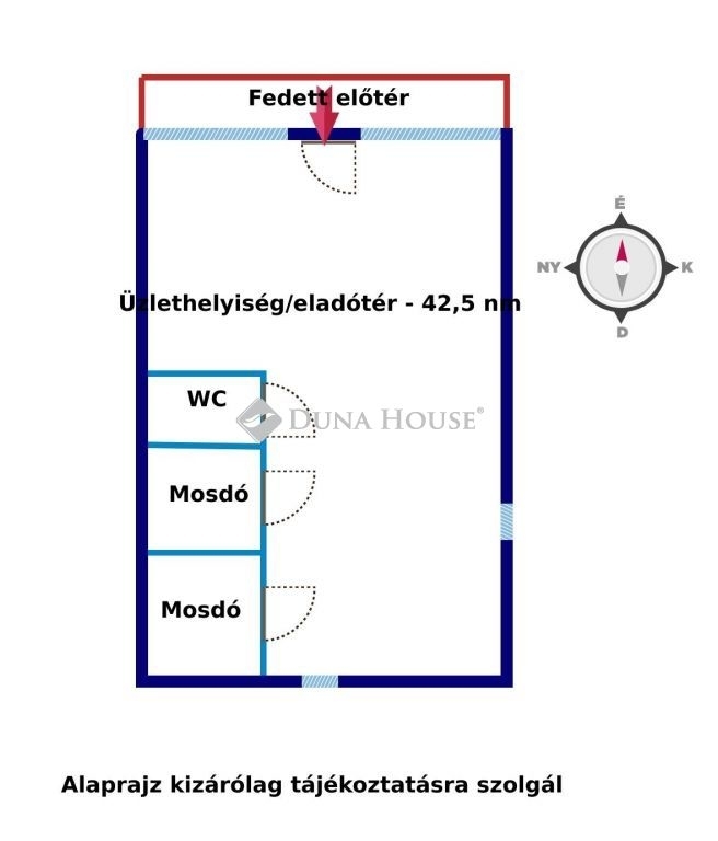 Az eladótér 43 m², így akár két elkülönített helyiségre is felosztható, a vizesblokkok közös használatával.