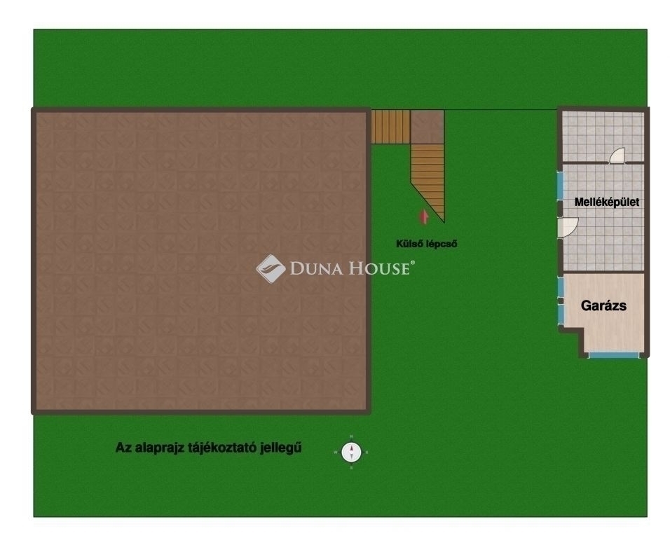 Nagy konyha: 13 m² (innen kijárat a 11 m²-es Fedett teraszra és az udvarra vezető külső lépcsősorhoz)