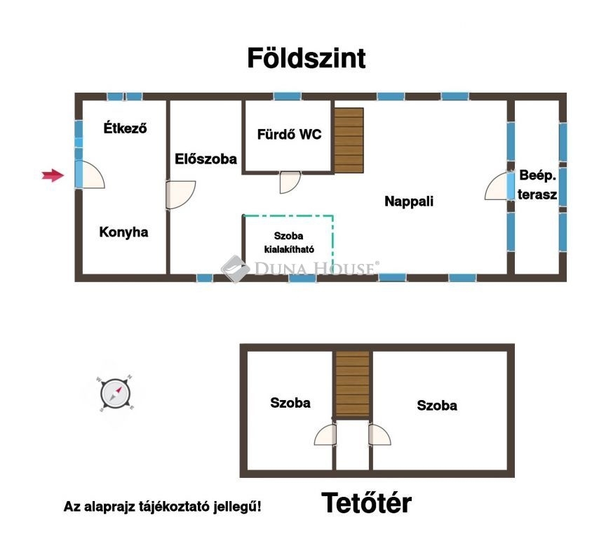 A ház 75m2-es. A földszinten az alábbi helyiségek találhatók: nappali, konyha étkezővel, előszoba és fürdő WC.