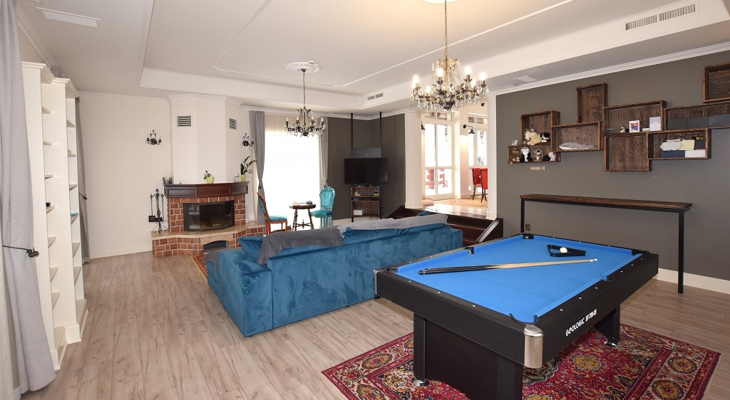 Földszinten található egy tágas nappali kandallóval, biliárdasztallal. Hatalmas étkező-konyha, mely elszeparálható igény szerint. A nappalin kívül van egy szintén tágas szivarszoba, mely használható társalgónak, irodának egyaránt vagy éppen egy külön lakrésznek is.
