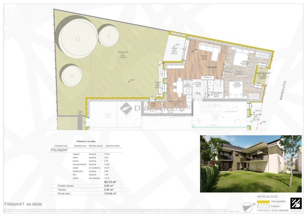 - 63 nm alapterület + 7 nm terasz + 116 nm saját használatú kert
