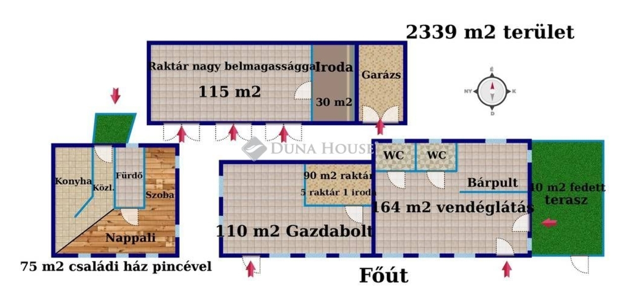 A tégla építésű, 200 m2-es, jelenleg is jól működő gazdabolt 110 m2-es eladótérrel rendelkezik. Ebből nyílik a 90 m2 területű 5 raktárból, és 1 irodából álló kiszolgáló rész. Az épület fűtése gáz konvektorokkal történik, melyet kiegészít a hűtő-fűtő klíma berendezés. Az épület kiváló állapotú, 3 fázissal ellátott villamosrendszerrel felszerelt.