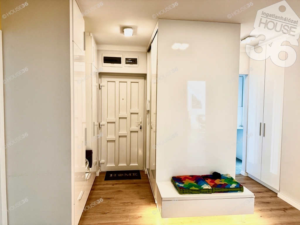 - hófehér gyönyörűen beépített magasfényű bútorok a konyhában, előszobában és a gardróbszobában