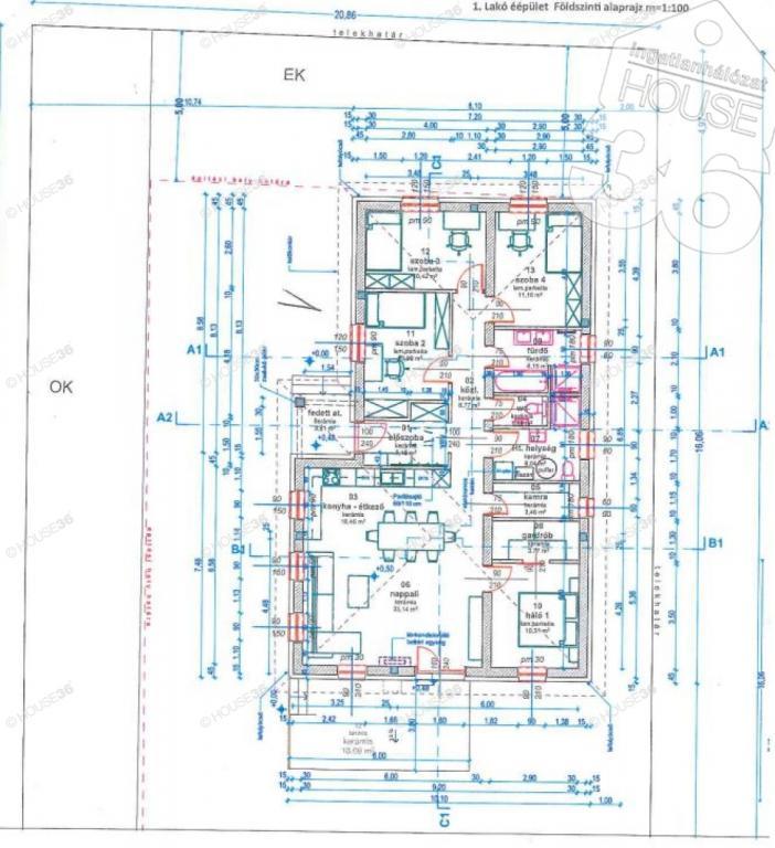 előszoba (5,15 m2), közlekedő (6,77 m2), WC (1,8 m2), fürdő (6,15 m2), Ht helyiség (6,04 m2), gardrób(3,77 m2) konyha + étkező (16,46 m2), nappali (23,14 m2), kamra (3,46 m2), szoba1(10,31 m2), szoba2 (10,09 m2), szoba3 (10,42 m2), szoba4 (11,19 m2)