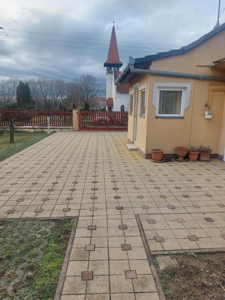 A térkövezett, parkosított udvar rendezett és praktikus kialakítású, ahol minden adott a kényelmes mindennapokhoz: