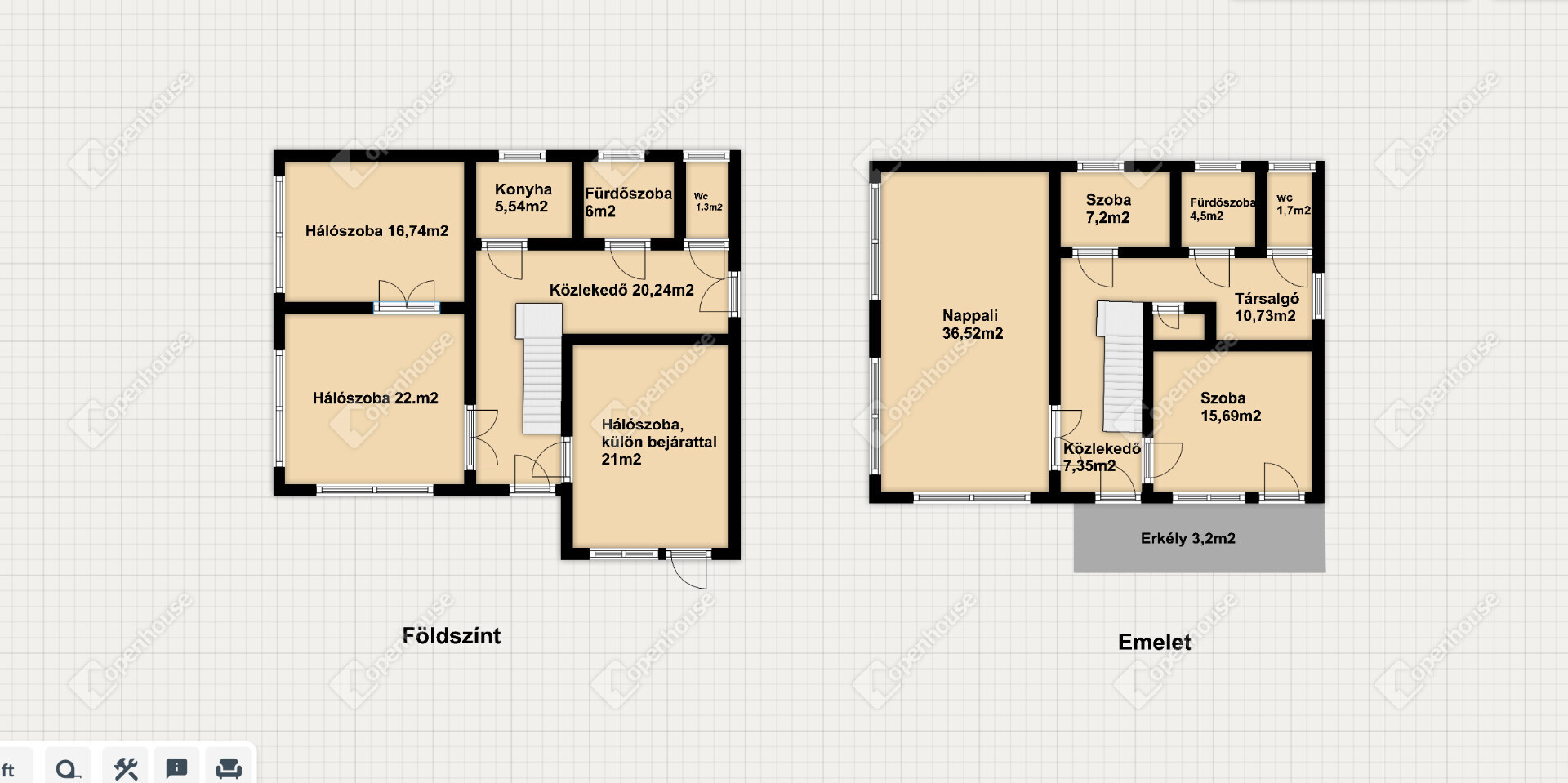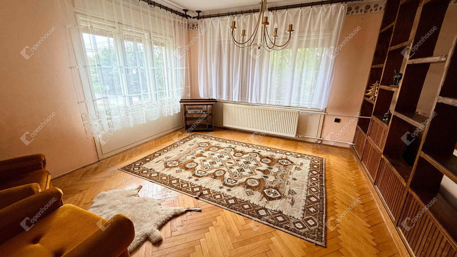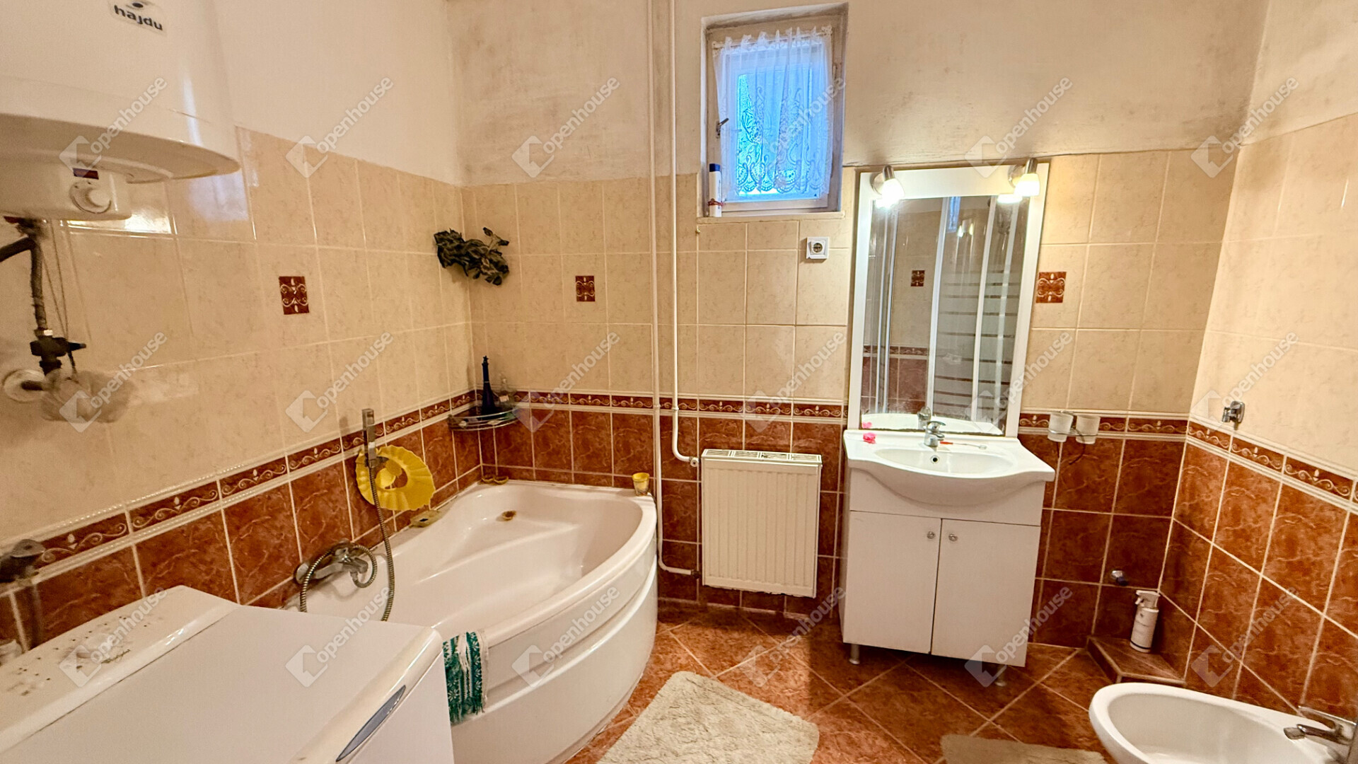 A ház 5 külön hálószobával (földszinten 3, emeleten 2) és egy tágas, 36 m²-es nappalival rendelkezik. Mindkét szinten fürdőszoba, a mellékhelyiség külön található. A fűtés radiátoros gázkazánnal, a melegvíz villanybojlerrel megoldott.