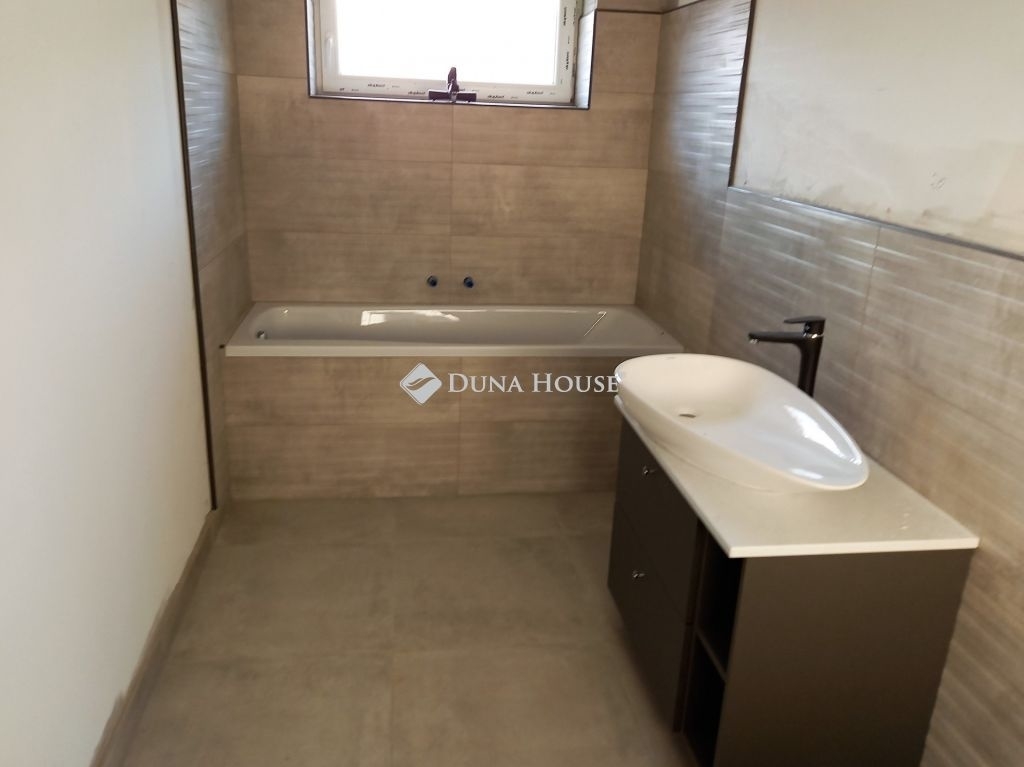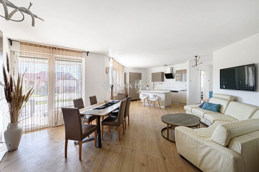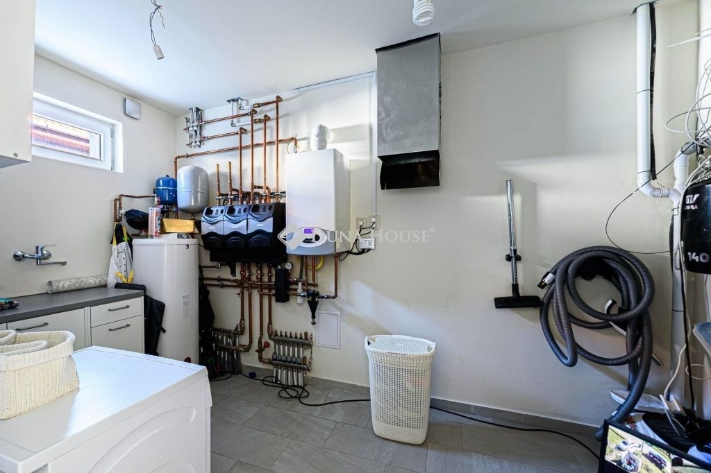 A nagyobbik lakás nappalijában és a közlekedőkben járólap, a szobákban nagy kopásállóságú laminált burkolat. A fűtést és a melegvizet gázkazán biztosítja. A nappaliban padlófűtés, a további helyiségekben radiátorok vannak. Kamera és riasztórendszer. 30 cm-es külső falvastagság és 15 cm-es szigetelés. Ehhez a házrészhez 836 nm-es telekterület tartozik, és összességében 65 nm-es terasz, nappali –konyha és étkező közel 70 nm-es, központi porszívó és központi szennyes ledobó van.