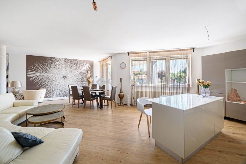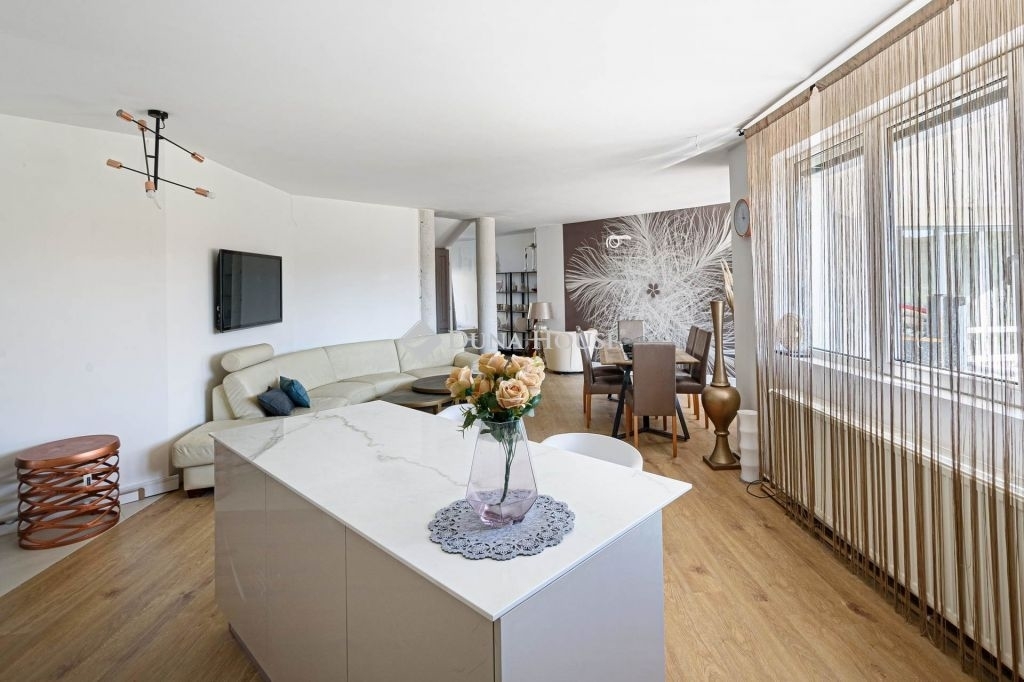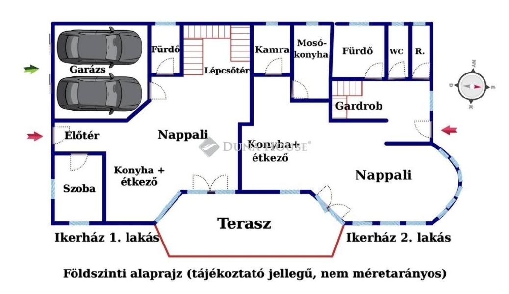 A másik lakásban a nappali mellett fűtött, dupla, két autó beállására alkalmas, motoros távműködtetésű ajtóval zárt garázs és 300 nm-es telekterület, összesen 48 nm terasz tartozik. A földszinten vagy az előszobából, vagy közvetlenül a garázsból a 58nm –es nappali-konyha-étkezőbe jutunk, amihez kapcsolódik a közös terasz és egy szülői háló. Jobbra nyílik egy fürdőszoba, mellette egy spájz. A széles lépcsőházban feljutva egy újabb nappali található, ebből nyílik 3 szoba, egy fürdőszoba, egy külön WC és a mosókonyha. Mindegyik szobához tartozik terasz gyönyörű panorámával.