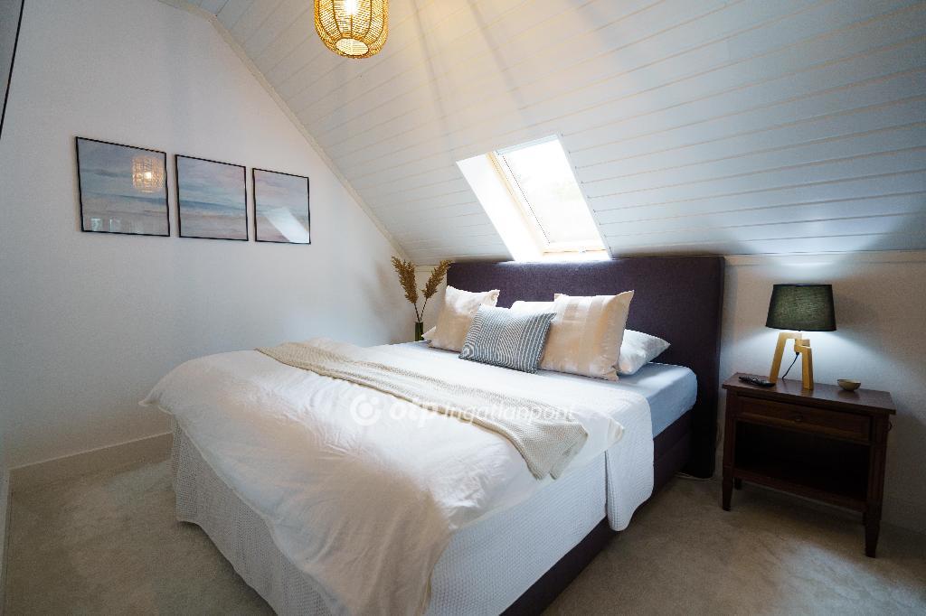 A separate, private apartment on the upper floor of a family house, featuring a generous open-plan living space and pleasant open views. The living room, dining area and kitchen form one continuous space, with large windows that bring in natural light and create an airy, relaxed atmosphere.