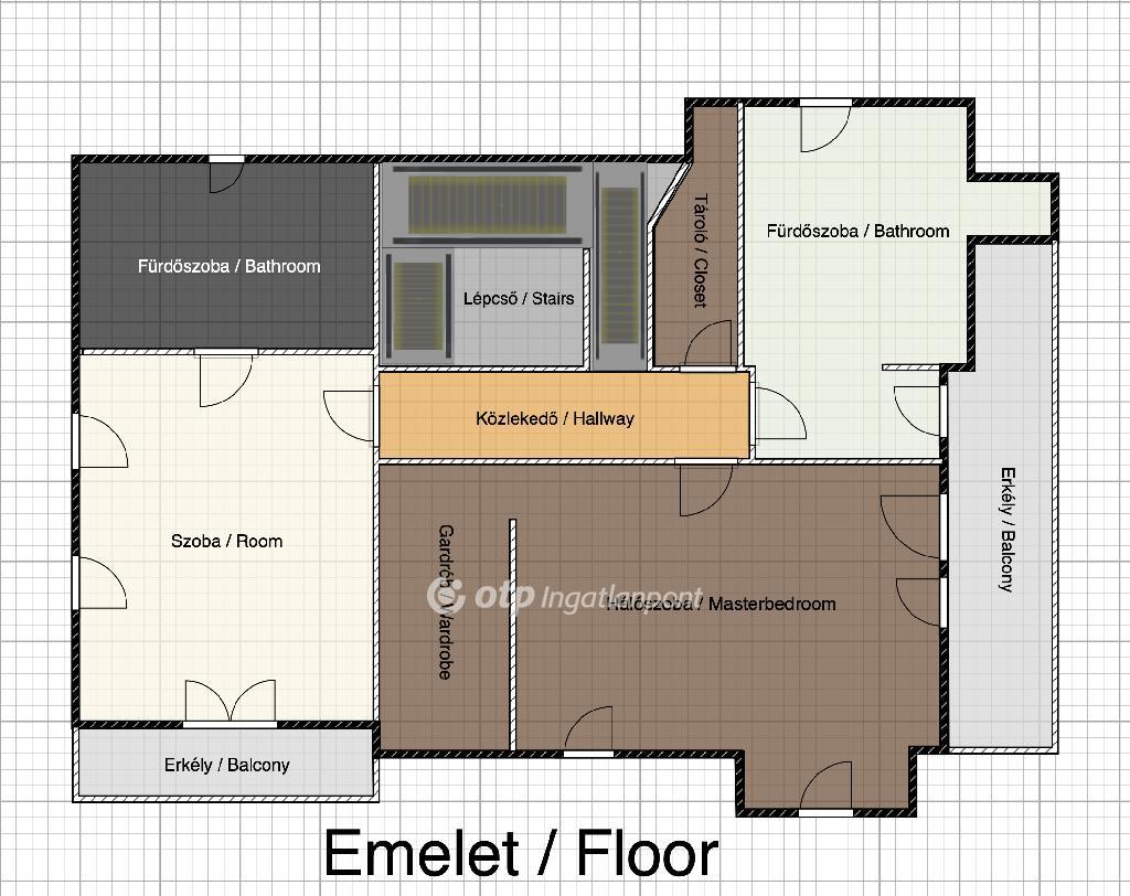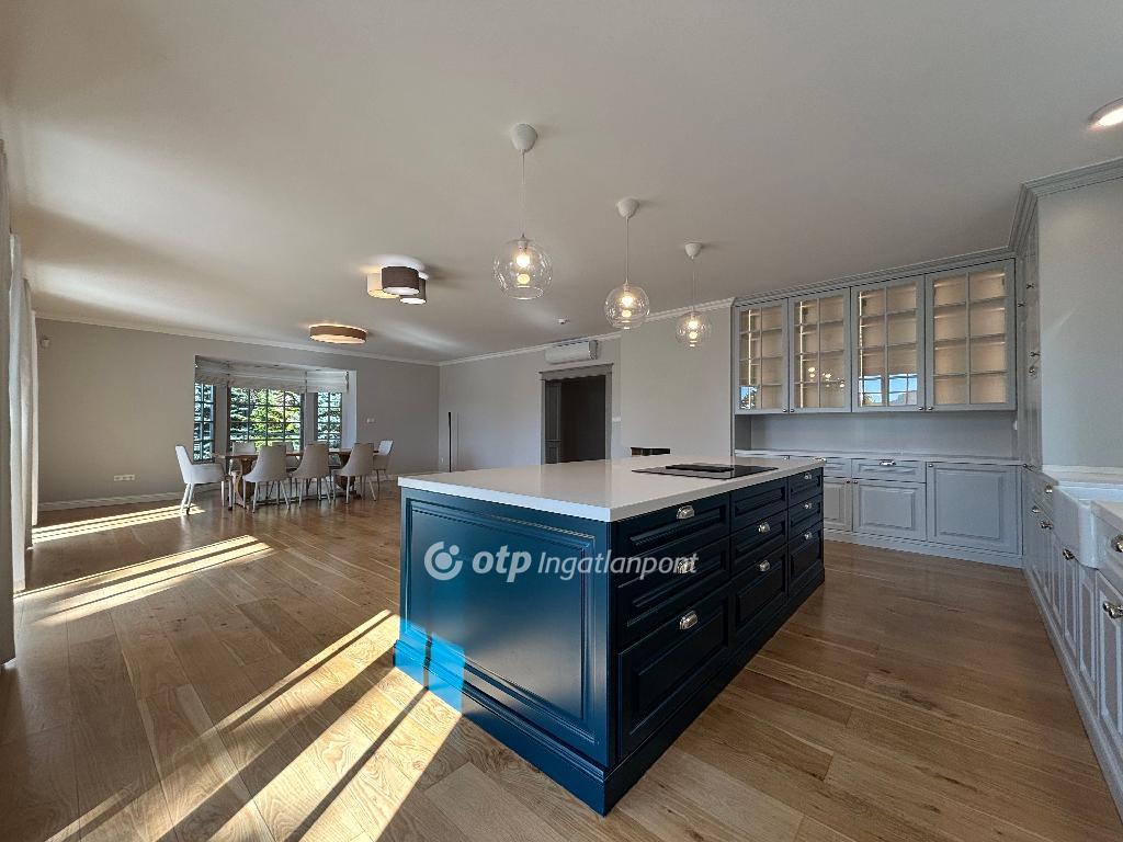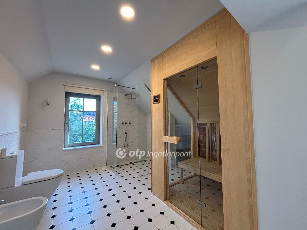 A tágas, 65 m2-es amerikai konyhás nappali fényárban úszik, a felső szinten található a szülői hálószoba gardróbbal és a fürdő szaunával, valamint egy további saját fürdőszobás háló. Az alsó szinten fitneszterem, mosókonyha és garázs helyezkedik el.