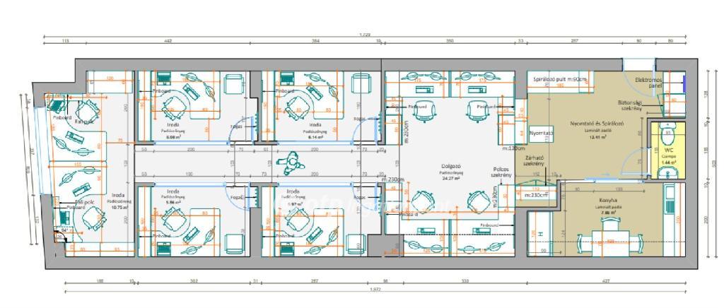 Az iroda elrendezése jelenleg egyterű illetve cellás (külön álló szobák) kialakítású, de természetesen ezen lehet változtatni.