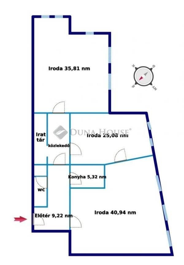 Minden helyiség az előtérből külön nyílik, az iroda elrendezése praktikus és jól használható.