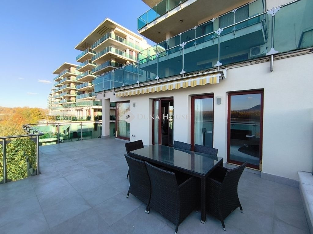 Az 50 m²-es, részben fedett teraszon motoros napellenző gondoskodik a kellemes árnyékról, míg a rattan étkezőasztal mellett ülve a Dunán elhaladó hajók látványa biztosítja a mindennapi kikapcsolódást. Az okos világítás telefonról vezérelhető, így bármikor a hangulatnak megfelelő színekben pompázhat a terasz.