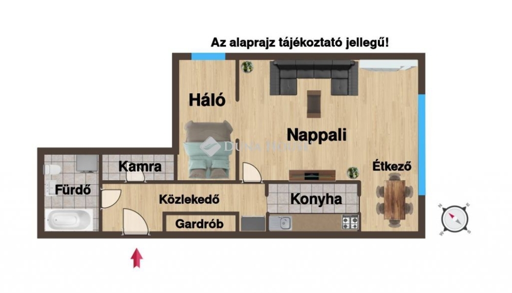 A nappali+étkező, hálószoba elrendezésű lakás keleti fekvésű nappali ablakai a ház gondnoka által rendben tartott zöld udvarra néznek, ahol reggeli napfelkelte közben, egy finom kávé elfogyasztása közben hallgathatjuk a madarak csicsergését.