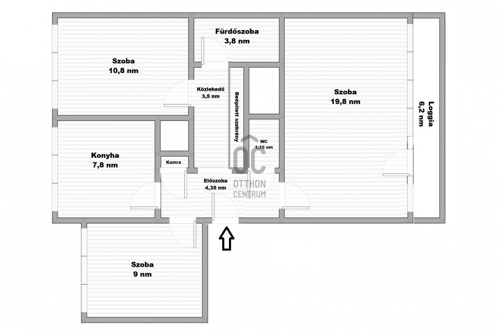 Elrendezés : 3 különnyíló szoba + konyha-étkező + kádas fürdőszoba + külön wc + kamra + loggia