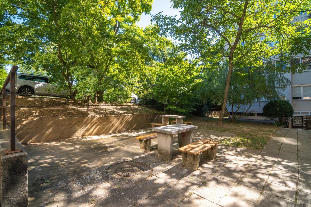 A társasház különlegessége a hatalmas, gondozott parkositott közös kert, kicsiknek játszótérrel.