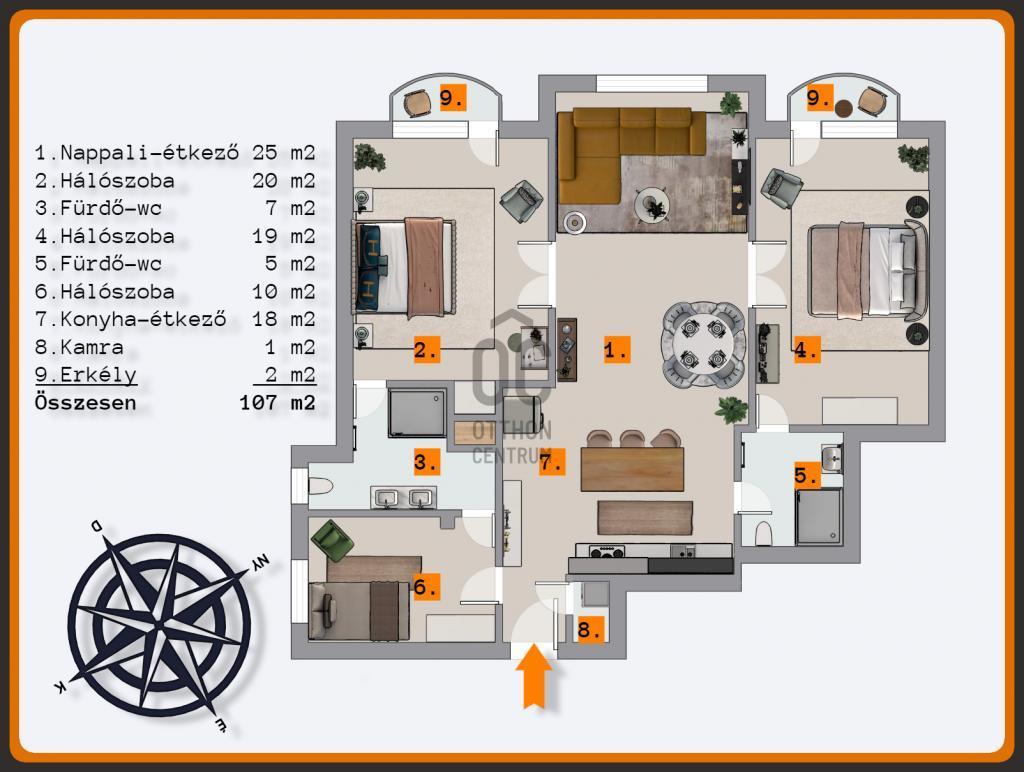- 1. emeleti, 108 m2, nappali + 3 szobás, dupla fürdőszobás, csendes és VILÁGOS lakás.