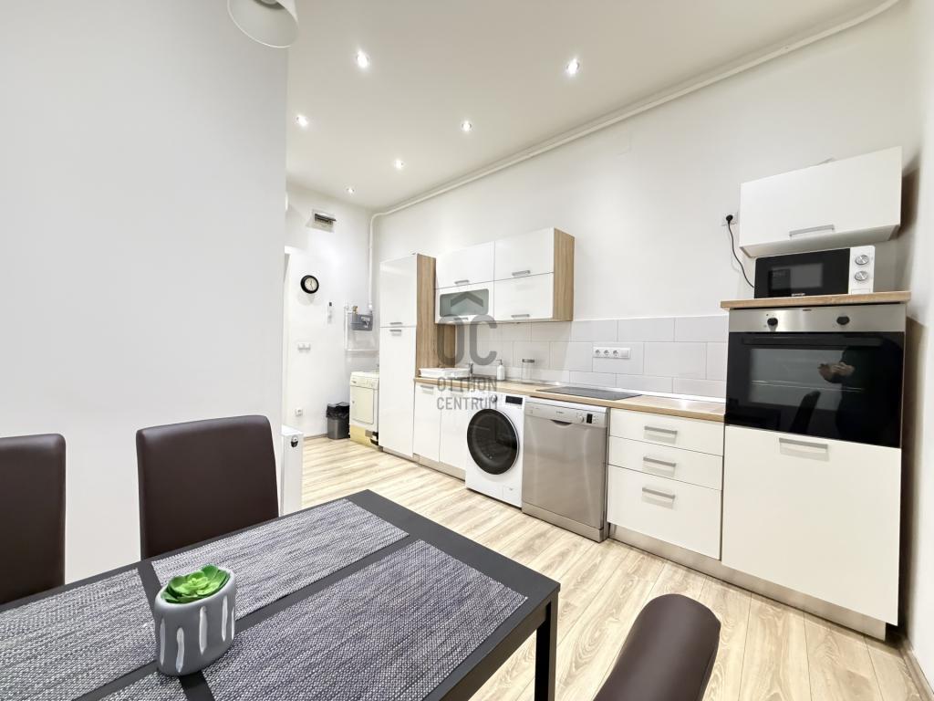 A lakás a képeken látható bútorokkal kerül kiadásra. A konyha teljesen gépesített, rendelkezésre áll mosó-szárítógép, mosogatógép, sütő, főzőlap és hűtőszekrény is, ami kényelmes és modern mindennapi használatot biztosít.