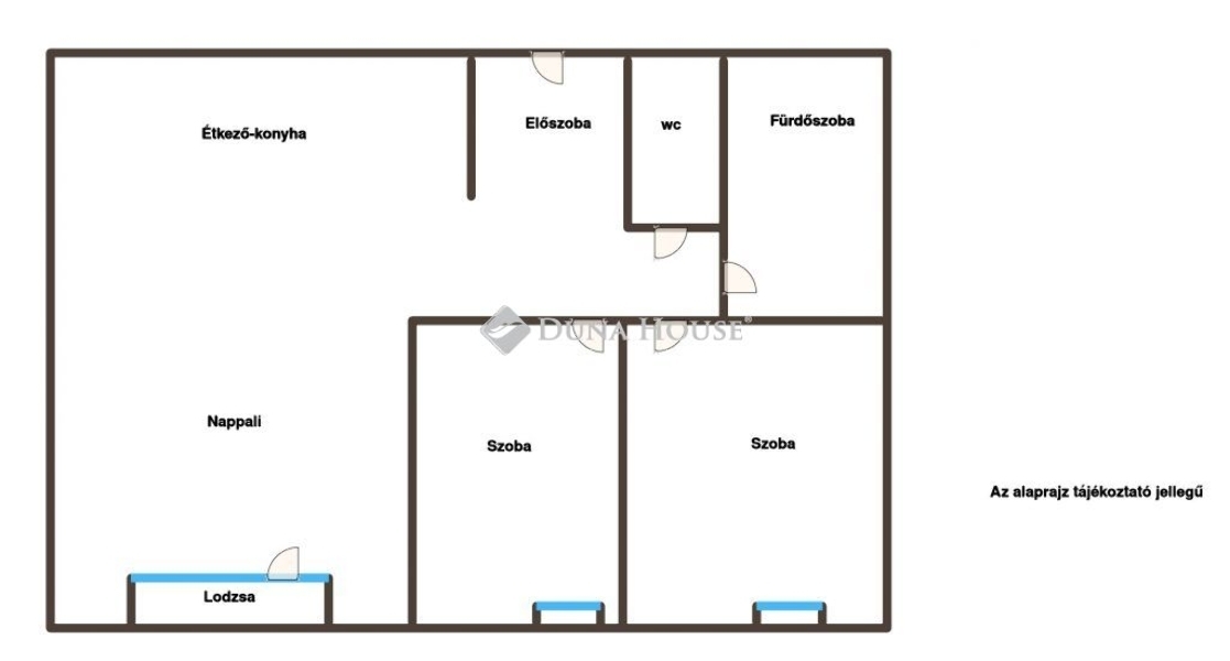 Modern elrendezés: amerikai konyhás nappali, két félszoba, külön WC és fürdőszoba