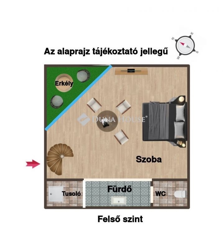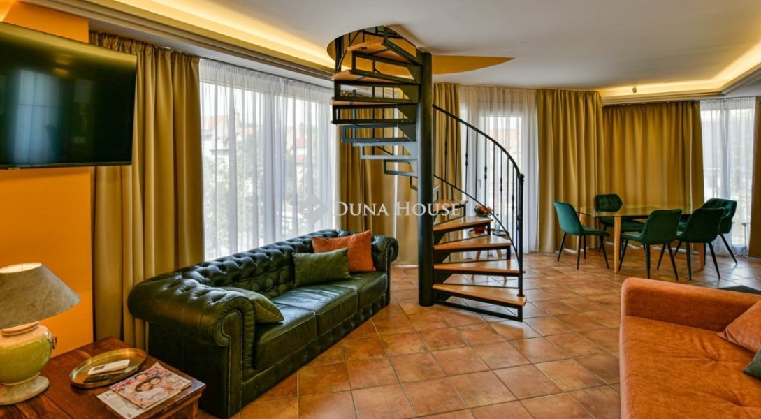 Felső szint: hálószoba második fürdőszoba és WCA lakás az első emeleten található, lifttel megközelíthető, és belső csigalépcső köti össze a két szintet.