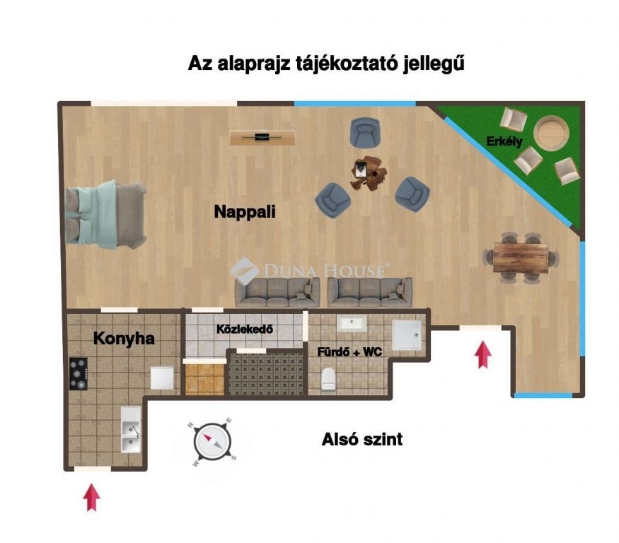 Alsó szint: modern konyha és étkező nagy nappali erkéllyel fürdőszoba és külön WC.