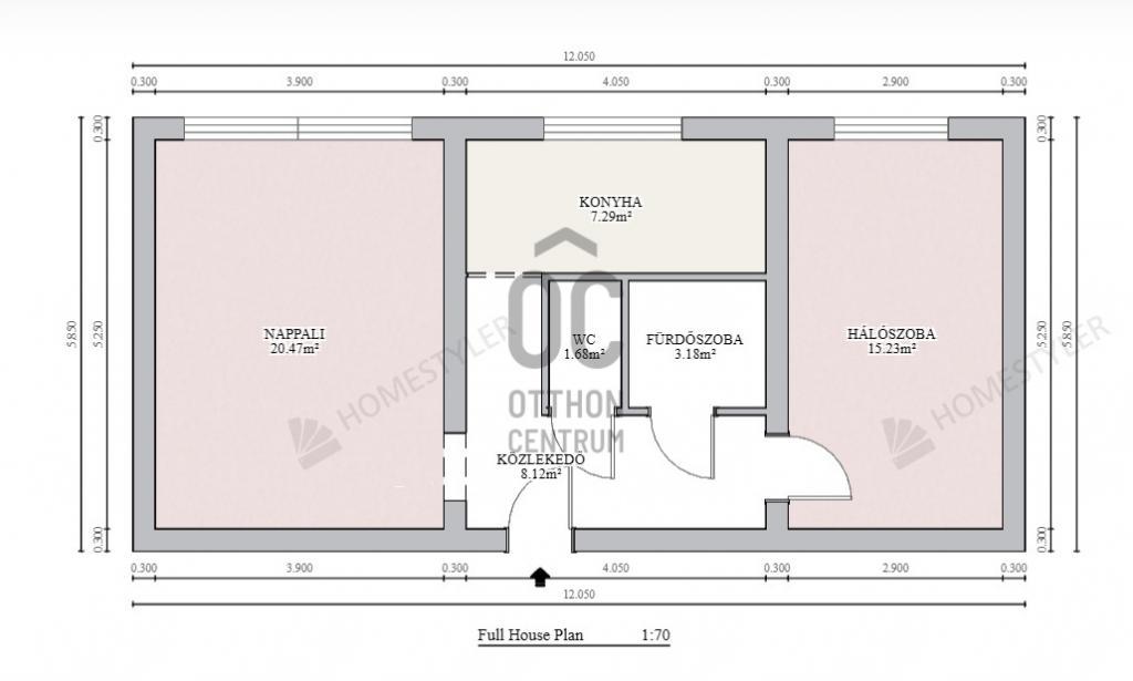 A lakás hasznos alapterülete 55 m², helyiségei egy konyha, kettő külön nyíló szoba, fürdőszoba külön WC helyiséggel és egy közlekedő.