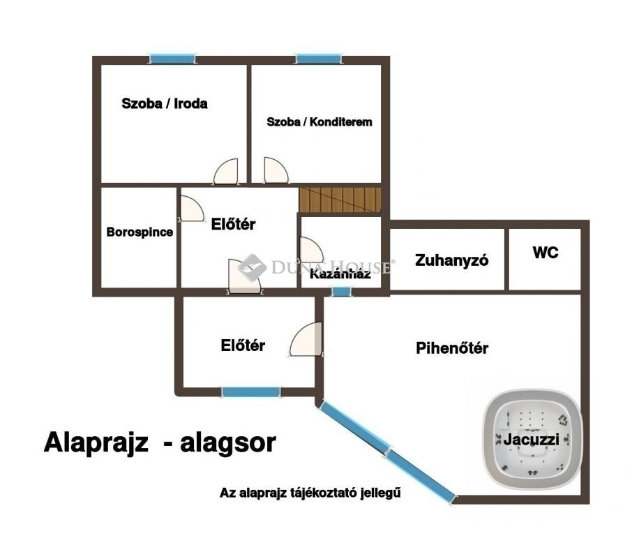 Alsó szinten hangulatos borospince fogadótérrel, edzőterem és iroda