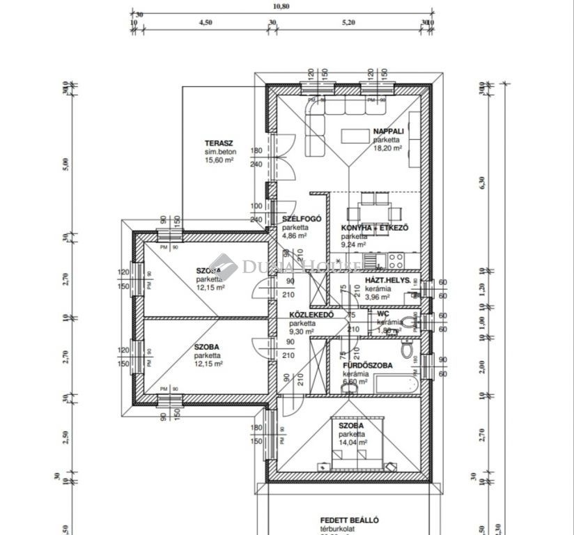 A tető szerkezete fa födémes,20 cm kőzetgyapot szigeteléssel,plusz betoncserép fedéssel.