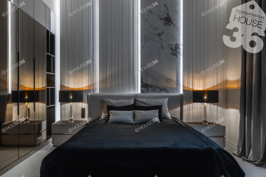 Neves tervezőiroda által megálmodott és egyedileg kivitelezett értékálló polgári lakás. Egyedileg tervezett bútorok, minőségi hidegburkolatok, led fény világítások mellett különleges Onyx kőből épitett bárpult is található.