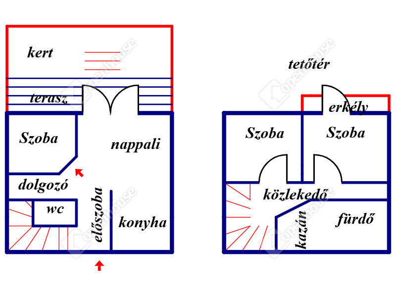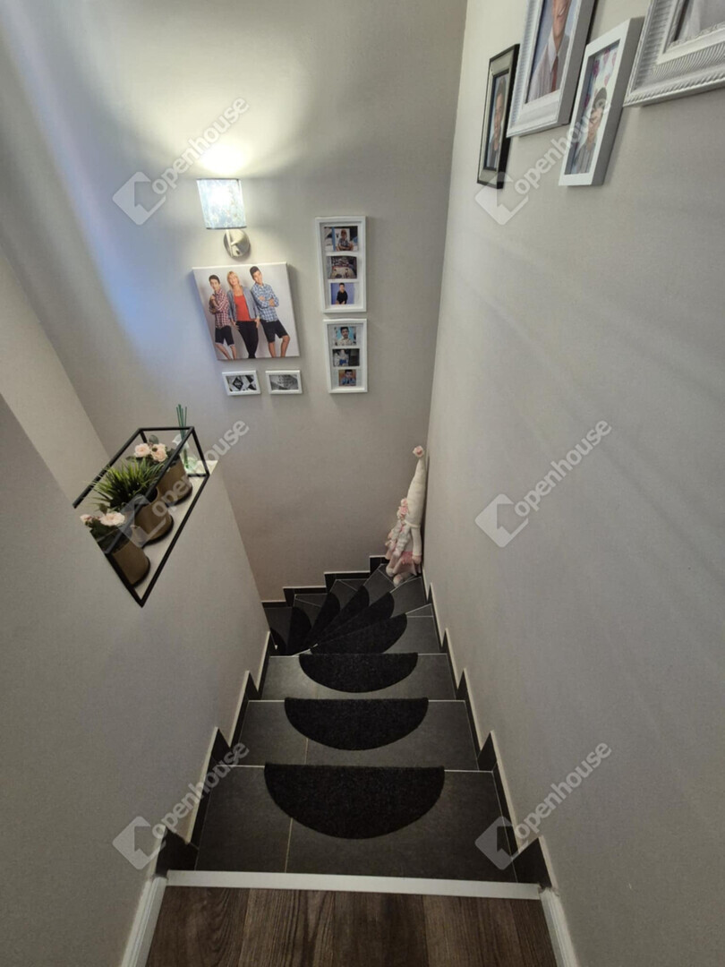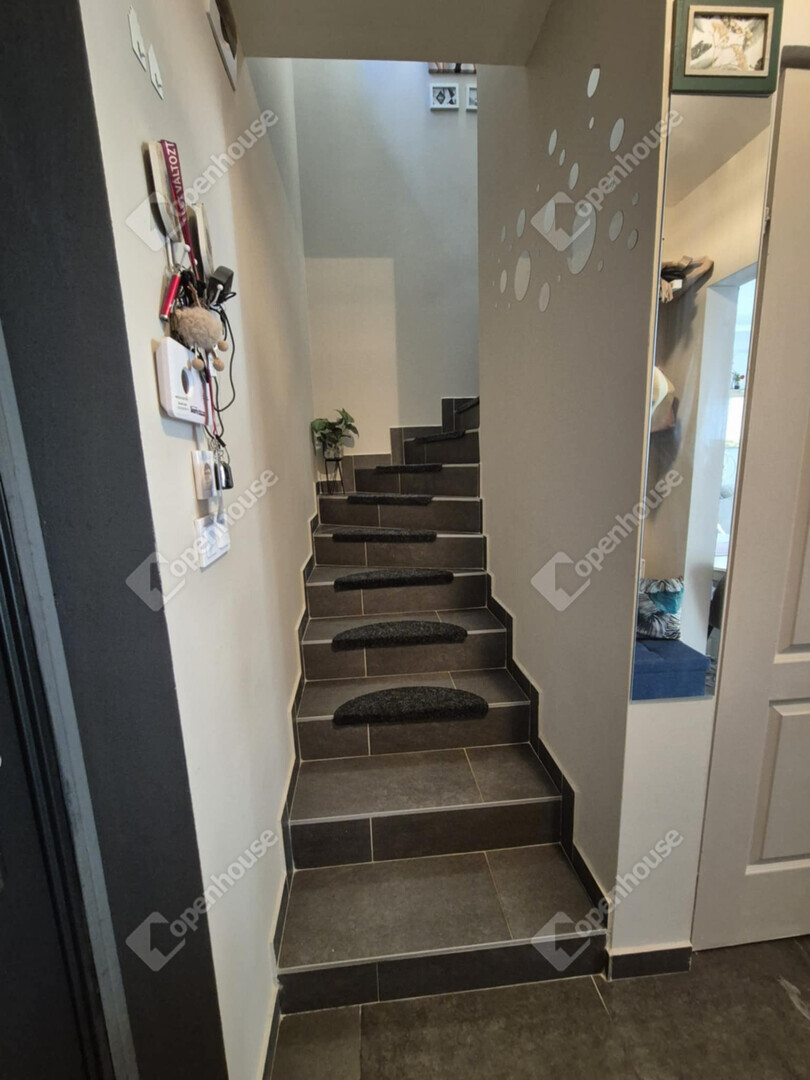 Az előszobából vezet fel egy igazán impozáns lépcső a tetőtérbe, ahol újabb 2 hálószoba, melyből az egyiknek egy kis privát terasza is van, valamint egy hatalmas fürdőszoba, mely fürdőkádas, + itt is egy mosdó, hogy az emeltről ne kelljen lemenni ha éjszaka mennünk kell.