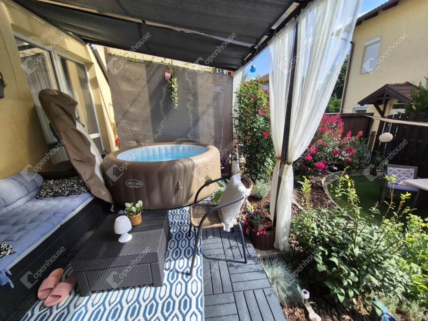 Az ingatlanban található 2 lakószint, melyből az alsó, földszinti részen található 1 hálószoba, egy amerikakonyhás-nappali, egy mosdó, az előszoba ahová belépünk az ingatlanba, illetve innen lehet felmenni az emeleti részre is, valamit egy kis smink vagy dolgozó sarok, beépített gardrób szekrényekkel. A nappaliból nyíló teraszajtó egy igazi egzotikus mesevilágba visz minket. A teraszon jakuzzi (az ár tartalmazza!) egy ebédlő garnitúra, és innen vezet lefelé az út egy mindössze 40nm-es privát kis kertbe. Fel sem tűnik, hogy a kert csak ekkora, mert annyira elbűvölő!! Mintha egy egzotikus szigeten lennénk. Pálmákkal, selyemirtusszal és még számtalan csodaszép növénnyel beültetett kis dzsungel. :)