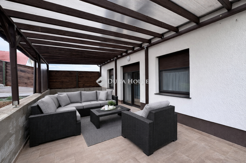 A világos nappaliból egy nagy, fedett terasz nyílik, amely ideális helyszíne lehet családi összejöveteleknek vagy baráti estéknek.