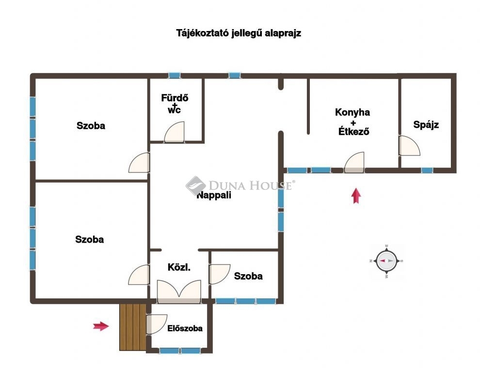 Belső elrendezés: nappali + 2 egész és 1 félszoba, jól szeparálható terek, két külön bejárat biztosítja a praktikus használatot akár két generáció számára is.