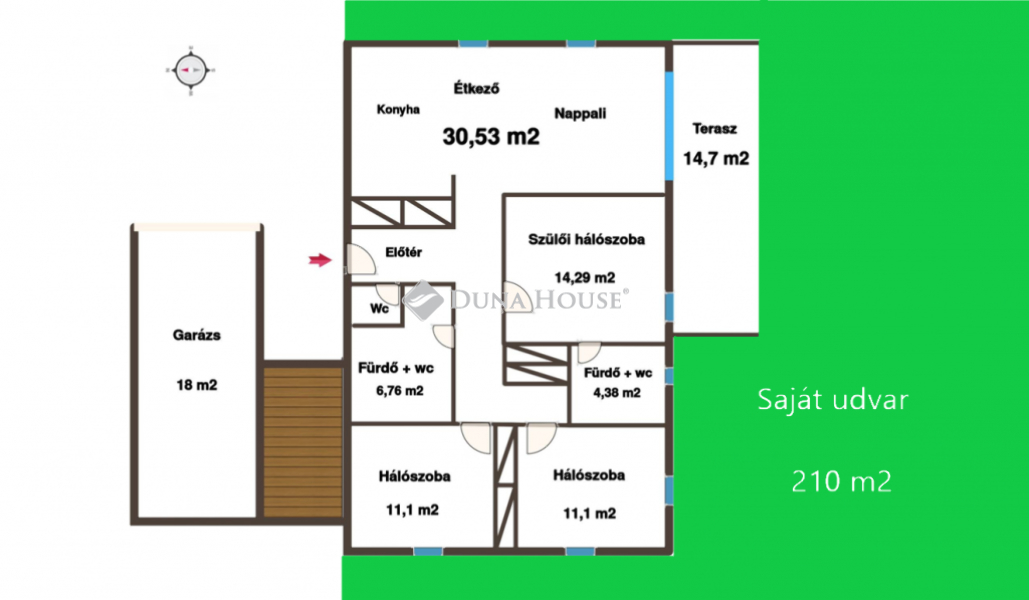 Saját udvar: 210 m² parkosítva (öntözőrendszerrel, füvesítéssel, 35 db fával)