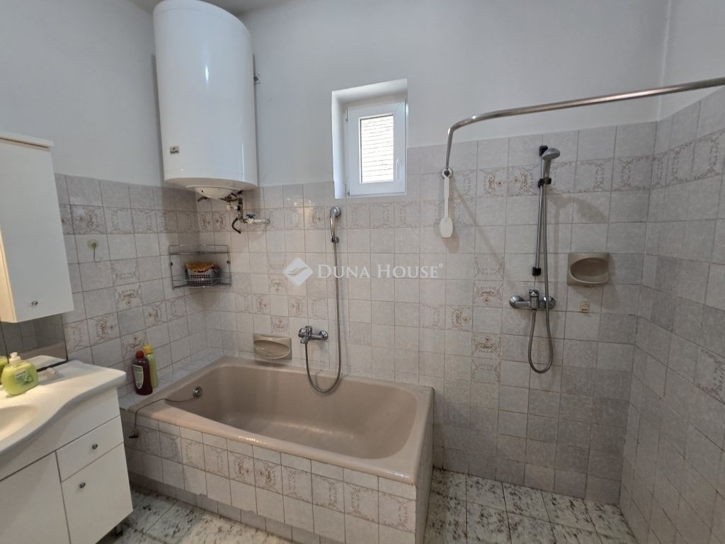 Az összközműves ingatlan földszintjén kialakításra került egy szoba, amely tökéletesen funkcionálhat nappaliként teraszkapcsolattal, egy közlekedő, egy étkező főzőfülkével, spejz, egy fürdőszoba zuhannyal és fürdőkáddal valamint külön álló illemhelyiség.