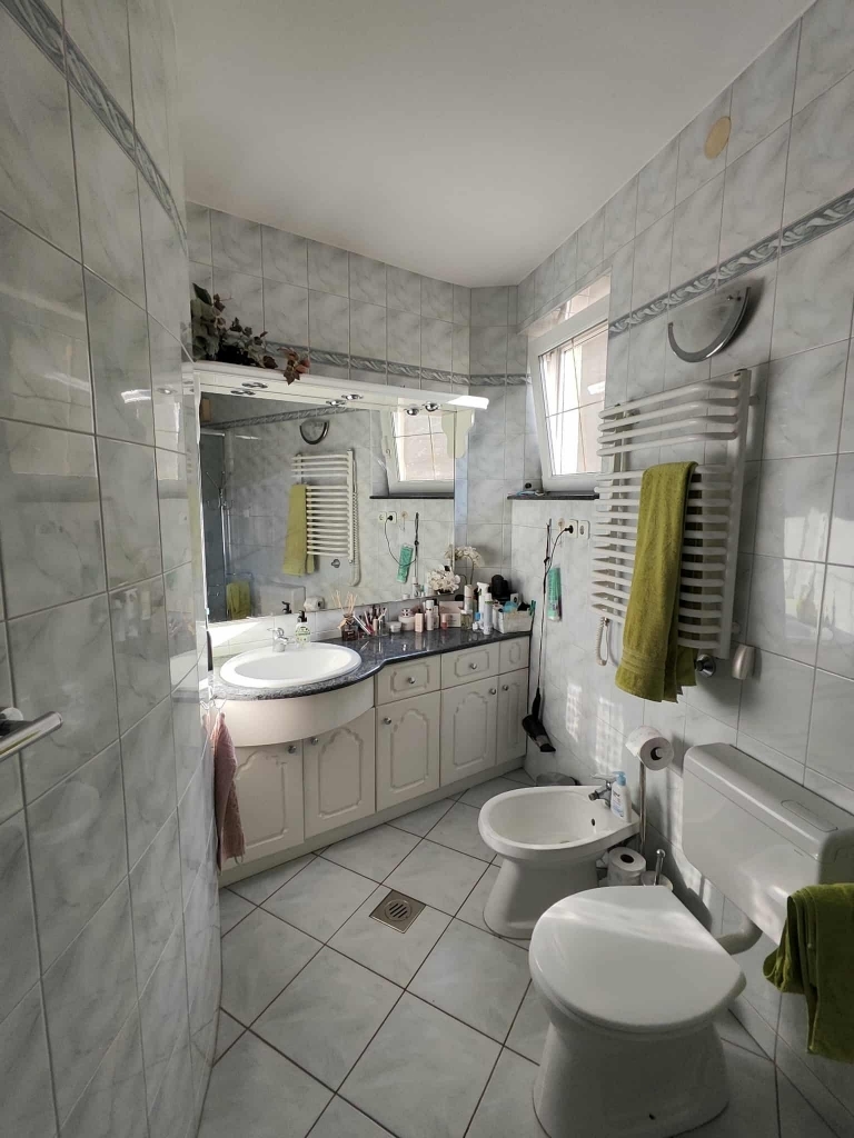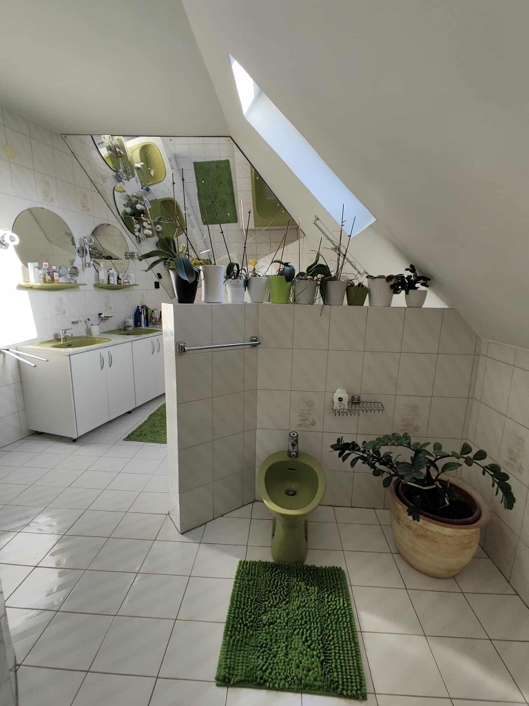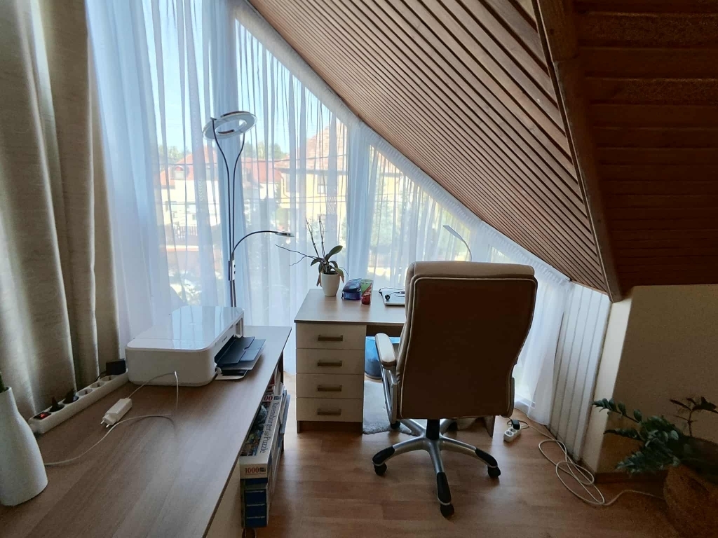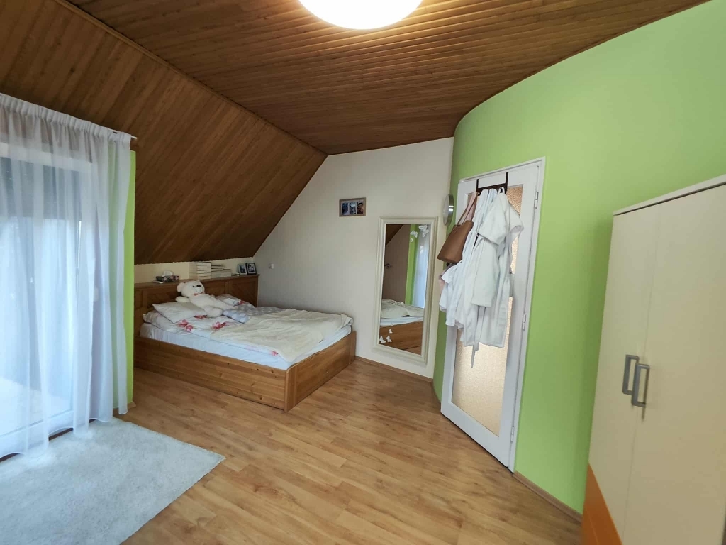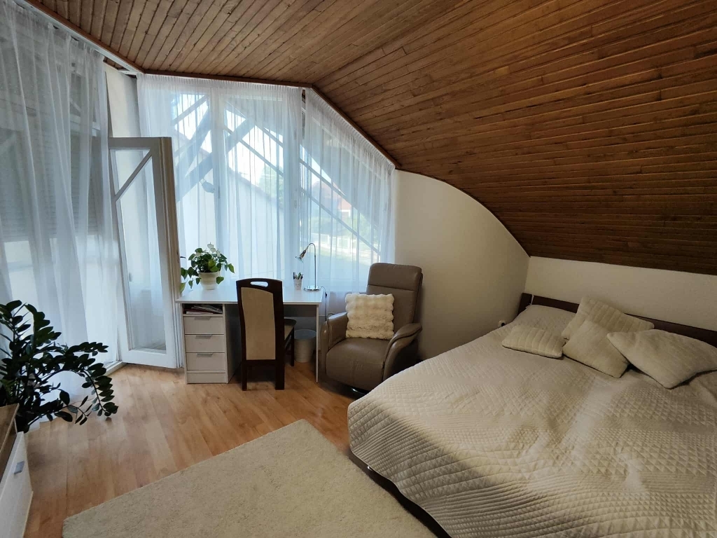 A tetőtérben három kényelmes méretű hálószoba és egy fürdőszoba található, WC-vel és bidével. A középső szint a mindennapok központja: a nagy nappali szoros kapcsolatban áll az étkezővel és a konyhával, így tökéletes színtere a családi együttléteknek. Ezen a szinten egy külön hálószoba és egy fürdőszoba is helyet kapott, így akár vendégek, akár idősebb családtagok számára is ideális megoldást kínál.