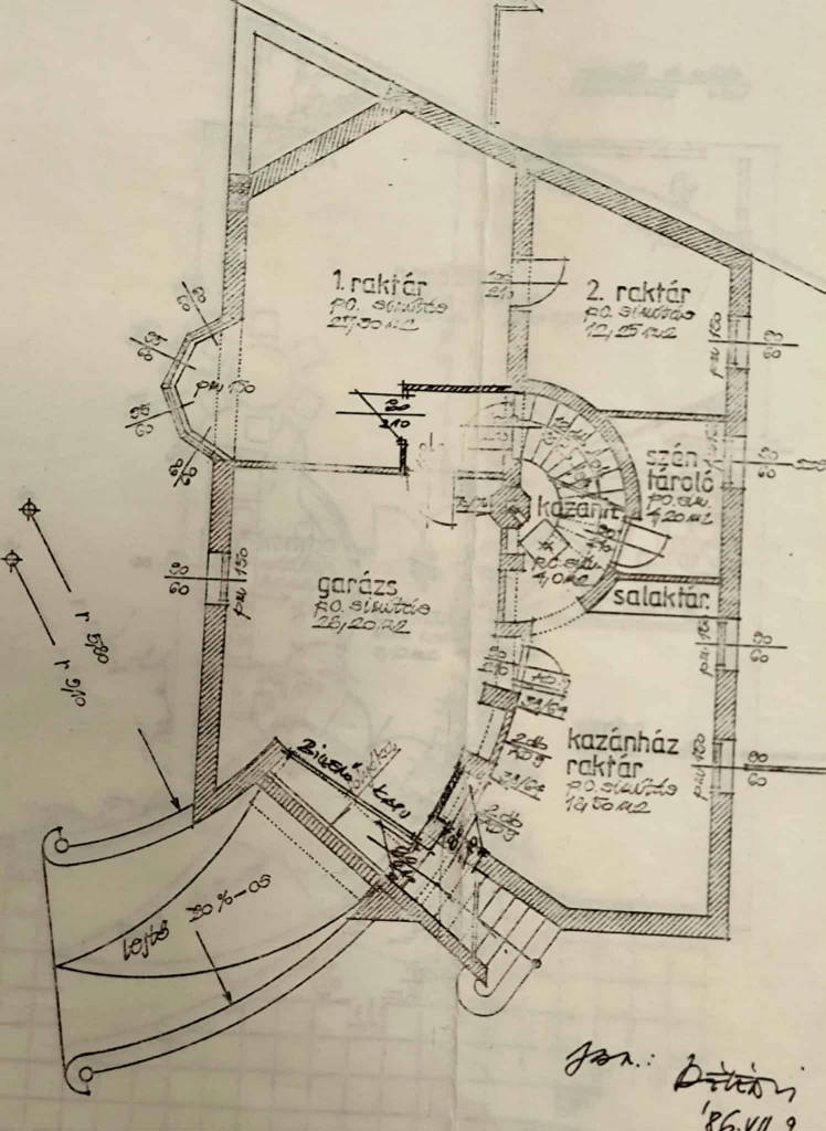 A szuterén szinten az eredetileg garázsnak épített, közel 60 m²-es helyiség jelenleg tárolóként funkcionál. Innen nyílik a mosókonyha, valamint itt kapott helyet a gázcirkó, amely a ház teljes egészében padlófűtést biztosít. A szint különlegessége egy téglával, boltívesen kirakott pince, amely ideális lehet borospinceként vagy hangulatos tárolóként.