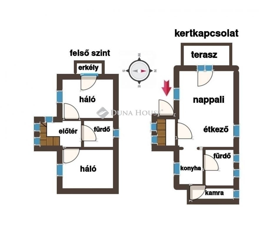A ház földszintjén teraszkapcsolatos nappali, étkező, konyha, kamra, fürdő, emeletén 2 hálószoba, erkély, fürdő, közlekedő kapott helyet. A fútés gáz cirkó radiátor hőleadókkal.