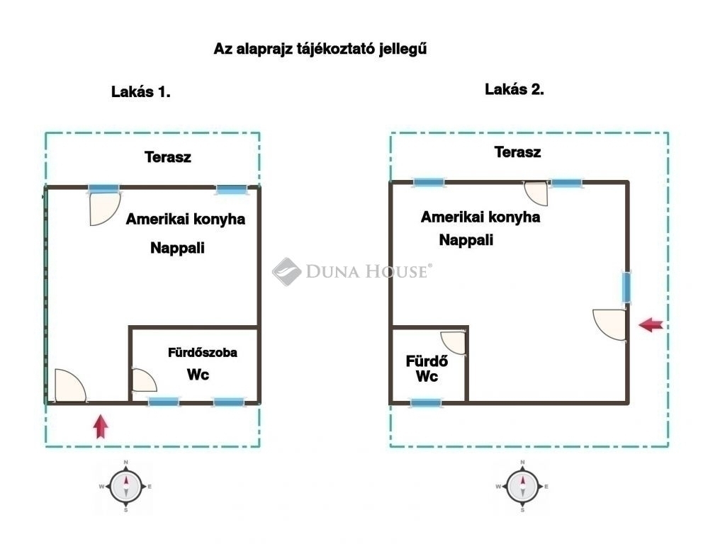 Mindkét lakás: amerikai konyhás nappali + fürdőszoba WC-vel + terasz