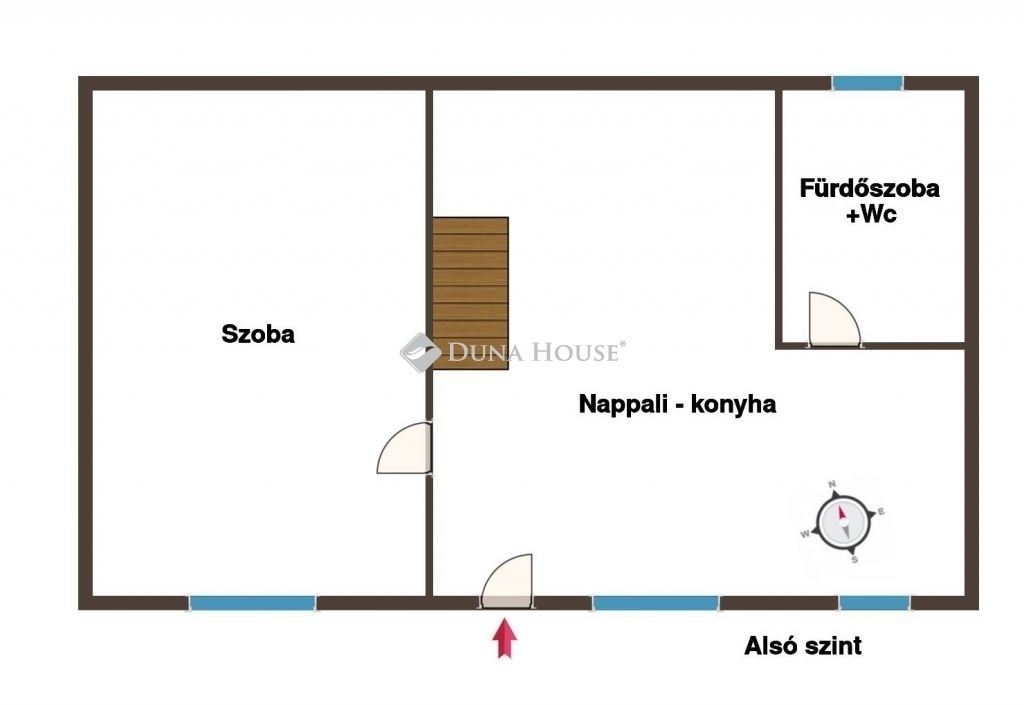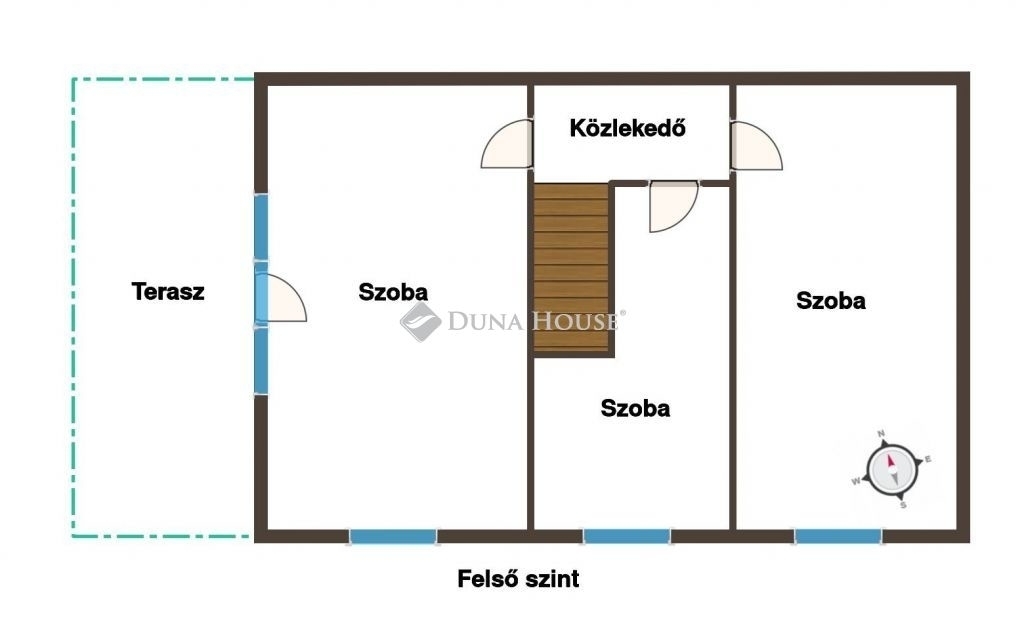Az ingatlan belső két szintes kialakítású, tetőterét 10 évvel ezelőtt építették be. Az alsó szinten egy amerikai konyhás nappali, egy fürdőszoba+wc, és egy különnyíló szoba, míg felső szintjén 3 különnyíló szoba, és az ezeket összekötő közlekedő helyiségek kaptak helyet. A legnagyobb emeleti szobából hangulatos, csendes terasz nyílik.