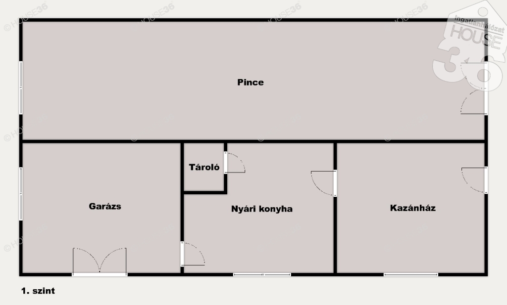 Az alsó, részben szuterénszinten, 102 m2 területen garázs, nyári konyha, kazánház és pince létesült.