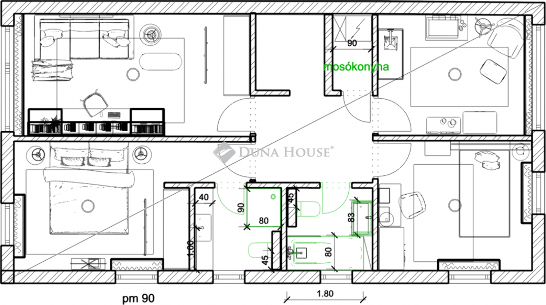 Kivételes figyelmet fordítottunk az ingatlan energiahatékonyságára; a modern hőszivattyús mennyezeti hűtés-fűtési rendszer, a padlófűtés, valamint a 4,3 kW teljesítményű napelemes rendszer garantálja a fenntarthatóságot és a környezettudatos életvitelt.